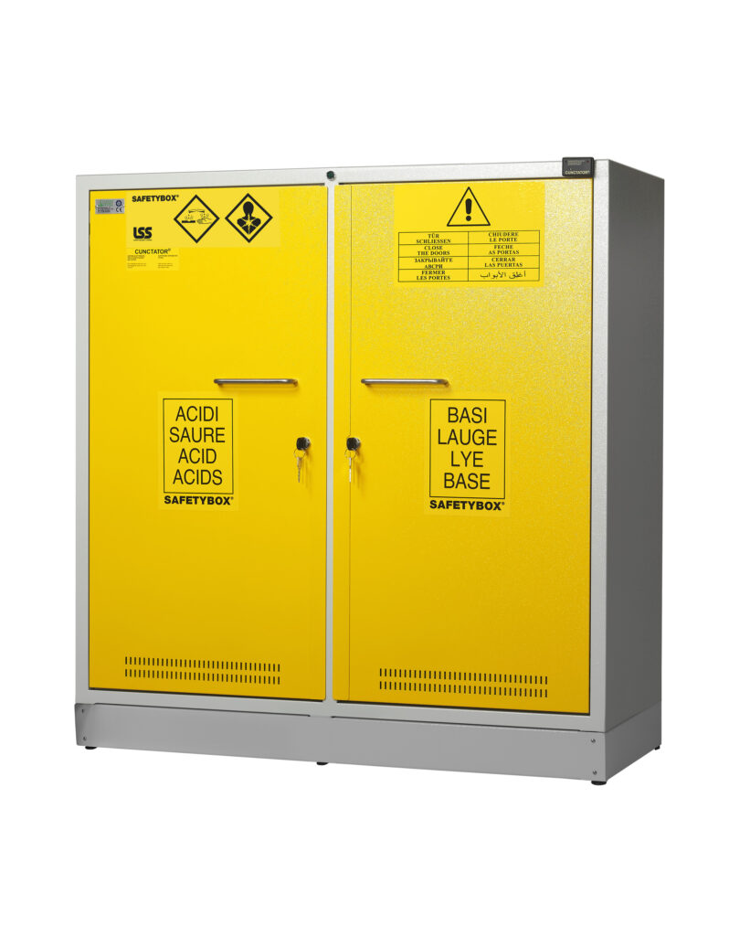 Gli armadi di sicurezza per chimici, acidi e basi SAFETYBOX 1100mm – AB 1100,certificati TUV con capacità 90lt per 108kg di peso, garantiscono lo stoccaggio di prodotti chimici, acidi e basi in conformità delle norme EN 61010-1, EN 16121, TEST PPP 52125A