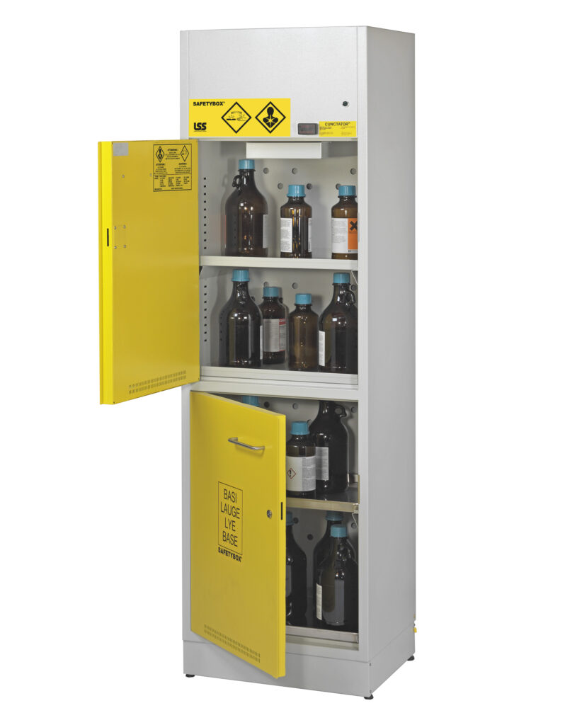 Gli armadi di sicurezza per chimici, acidi e basi SAFETYBOX 600mm – AB 600, certificati TUV con capacità 90lt per 100kg di peso, garantiscono lo stoccaggio di prodotti chimici, acidi e basi in conformità delle norme EN 61010-1, EN 16121, TEST PPP 52125A